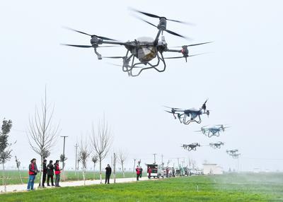 石家莊市欒城區(qū)恒豐種植專業(yè)合作社的麥田里,麥苗從地里冒出來一拃左右,十幾臺大型植保無人機和智能化農機正在對麥田進行水肥綜合治理作業(yè)。