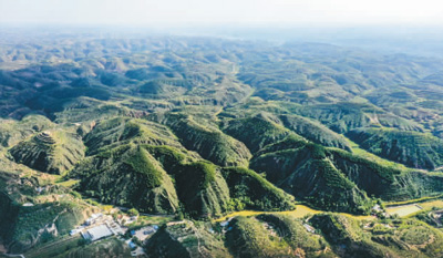 黃土溝壑中的陜西榆林市米脂縣銀州街道高西溝村滿眼綠色(無人機照片)。