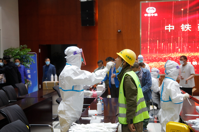 建設者在湖杭鐵路杭州西站指揮部大會議室內做核酸檢測。周蕊攝