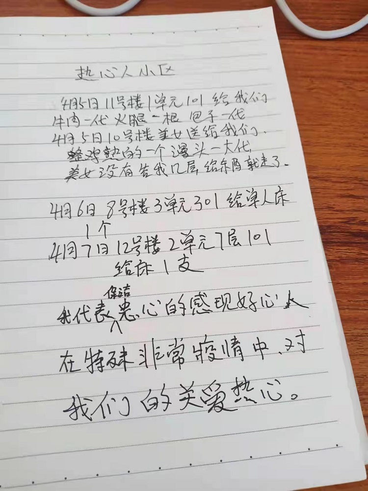 “4月5日,11號樓1單元101,給我們牛肉一袋,火腿一根,包子一袋;4月5日,10號樓送來整雞一個,饅頭一大袋,但是沒有留下具體門牌就走了;4月6日,8號樓3單元301給單人床一個;4月7日,12號樓2單元7層101給床一個。我代表保潔衷心地感謝好心人,在非常時期,對我們的關(guān)愛。”