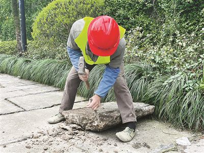 “我們秉持‘最小干預(yù)’的原則——結(jié)構(gòu)層穩(wěn)定的老石板,原則上不修;需要修繕的老石板,則嚴(yán)格遵守‘修舊如舊、保留肌理’的原則?!焙贾輬@林設(shè)計院股份有限公司相關(guān)負(fù)責(zé)人介紹,“一般兩種情況下才進(jìn)行修復(fù),一是樹池周邊起拱、松動嚴(yán)重,二是老石板破損、松動嚴(yán)重。”
