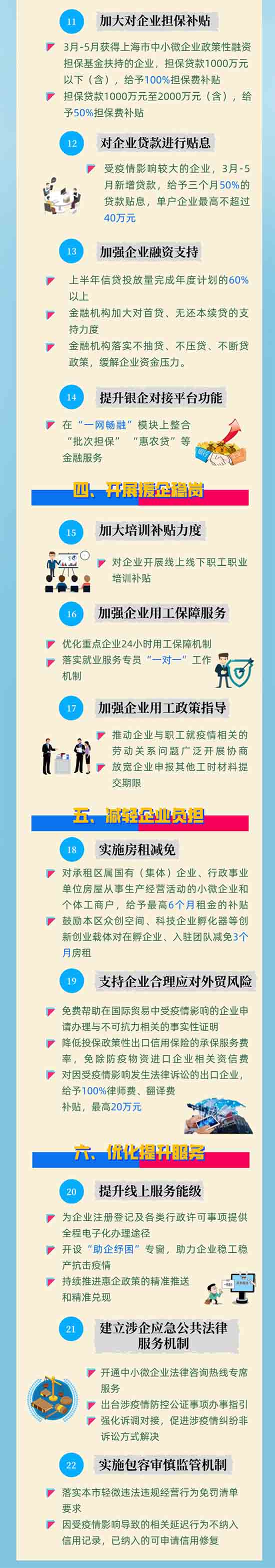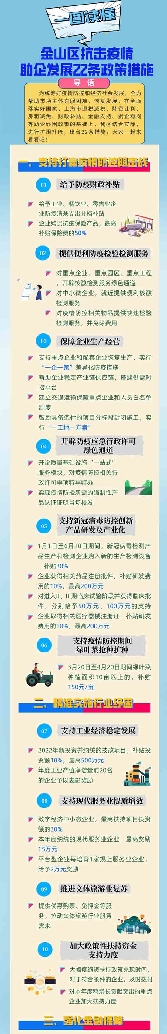 據(jù)悉,為統(tǒng)籌好疫情防控和經(jīng)濟(jì)社會(huì)發(fā)展,全力幫助市場(chǎng)主體克服困難、恢復(fù)發(fā)展,在全面落實(shí)好國(guó)家、上海市退稅減稅、降費(fèi)讓利、房租減免、財(cái)政補(bǔ)貼、金融支持、援企穩(wěn)崗等助企紓困政策的基礎(chǔ)上,結(jié)合金山實(shí)際,進(jìn)行擴(kuò)圍升級(jí),制訂《金山區(qū)抗擊疫情助企發(fā)展22條政策措施》?!?2條”既聚焦企業(yè)當(dāng)前面臨的“難點(diǎn)”“痛點(diǎn)”“堵點(diǎn)”,又考慮到疫情后企業(yè)加快發(fā)展的各項(xiàng)訴求,共計(jì)包括六大方面內(nèi)容,即支持打贏疫情防控阻擊戰(zhàn)、精準(zhǔn)實(shí)施行業(yè)紓困、強(qiáng)化金融保障、開展援企穩(wěn)崗、減輕企業(yè)負(fù)擔(dān)及優(yōu)化提升服務(wù),用實(shí)實(shí)在在的舉措,精準(zhǔn)幫助市場(chǎng)主體紓困解難,穩(wěn)定經(jīng)濟(jì)增長(zhǎng)。