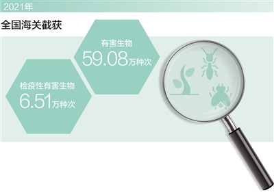 據(jù)統(tǒng)計,2021年,全國海關截獲有害生物59.08萬種次、檢疫性有害生物6.51萬種次,首次檢出致死粒線蟲、鈴蘭短體線蟲、北美齒小蠹等危險性有害生物,有效防止紅火蟻、高致病性禽流感等重大動植物疫情疫病傳入,退回、銷毀不合格農(nóng)產(chǎn)品584批。