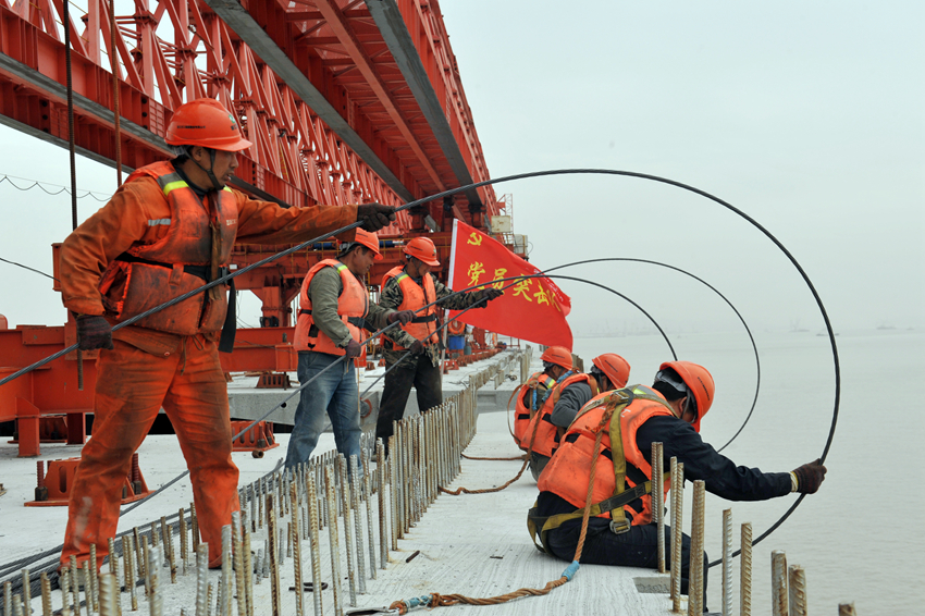 黨員先鋒突擊隊(duì)在魚(yú)山大橋建設(shè)現(xiàn)場(chǎng)。舟山市委組織部供圖