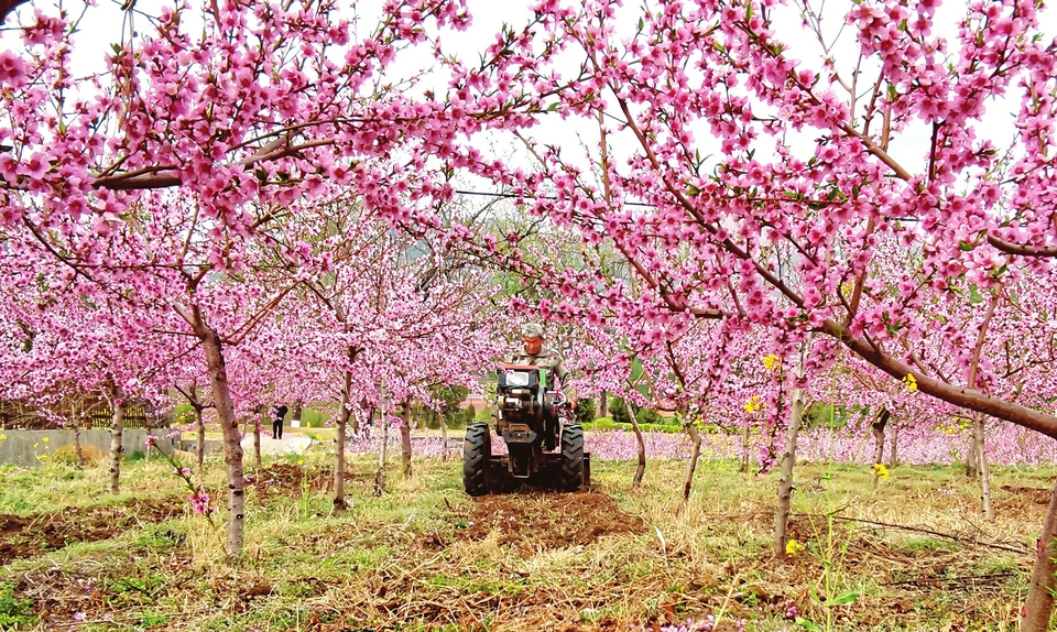 4月12日,左權(quán)縣上武村百畝桃園花開(kāi)太行,農(nóng)民正在使用拖拉機(jī)松土施肥耕作管護(hù)。上武村地處太行百里畫(huà)廊的核心區(qū)域,近年來(lái),該村積極推動(dòng)農(nóng)旅融合,發(fā)展生態(tài)旅游,每到春天,連片的桃花競(jìng)相綻放、美如云霞,構(gòu)成一幅太行田園風(fēng)光圖,吸引了游客踏青賞春,促進(jìn)了產(chǎn)業(yè)發(fā)展農(nóng)民增收。(邢蘭富攝)