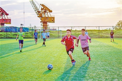 4月9日,在利用廢舊碼頭改造而成的安徽省銅陵市濱江生態(tài)體育公園,足球愛(ài)好者競(jìng)逐綠茵,不遠(yuǎn)處的碼頭吊臂高高矗立。近年來(lái),各地注重盤活城市空閑土地,通過(guò)新建或改擴(kuò)建體育公園、公共體育場(chǎng)館等,加大全民健身場(chǎng)地設(shè)施供給。