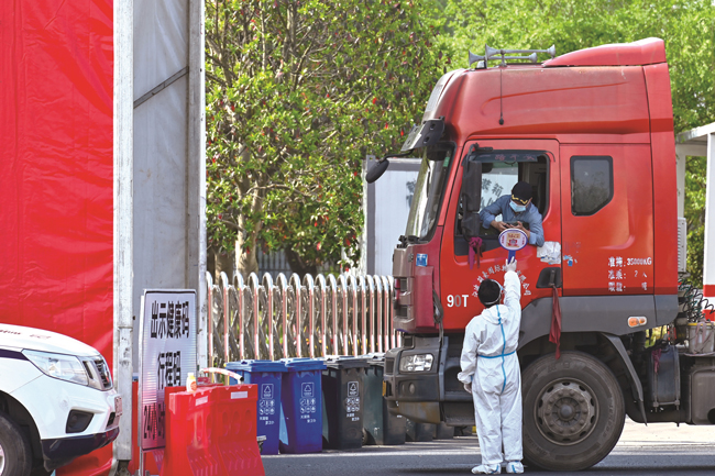 4月21日,在嘉興市嘉善縣天凝高速出入口,交警正在核驗過往司乘人員的健康碼、行程卡、核酸檢測報告和有無途經(jīng)中高風險地區(qū)等信息,筑牢疫情防線,保障物流安全暢通。(張啟帆)
