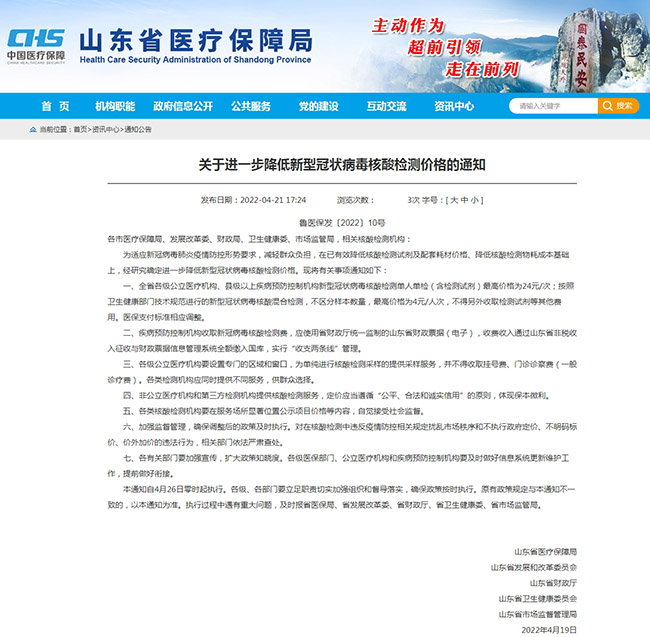 人民網(wǎng)濟(jì)南4月22日電(聶俊穹)21日,山東省醫(yī)保局、省發(fā)改委、省財(cái)政廳、省衛(wèi)生健康委、省市場(chǎng)監(jiān)管局等五部門聯(lián)合印發(fā)文件,自2022年4月26日零時(shí)起,進(jìn)一步降低新型冠狀病毒核酸檢測(cè)價(jià)格。