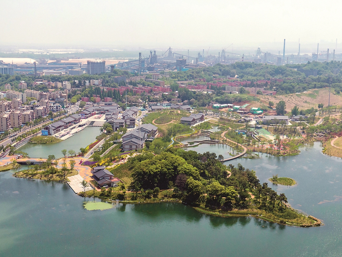 自二〇二一年起,南京啟動(dòng)幸福河湖建設(shè)行動(dòng),截至目前,十七條幸福河湖已經(jīng)建成。圖為昨日航拍的南京桃湖公園。 本報(bào)記者 陳儼 攝