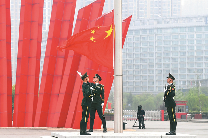 鮮艷的五星紅旗緩緩升起,迎著江風高高飄揚。 本報記者 萬程鵬 攝