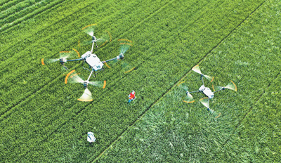 河南省尉氏縣植保隊(duì)員在麥田進(jìn)行“一噴三防”作業(yè),與傳統(tǒng)方式相比,無人機(jī)噴灑可減少農(nóng)藥使用量。