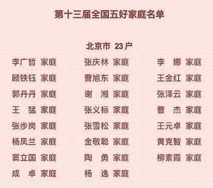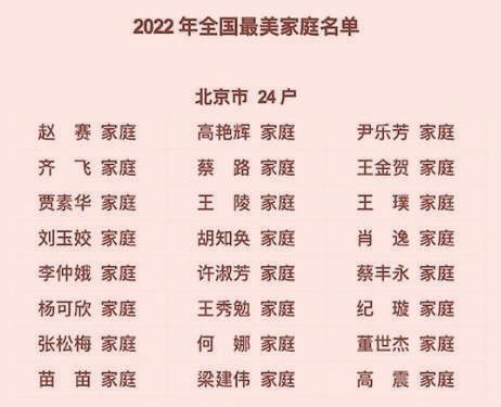 本報(bào)訊(記者 代麗麗)在5月15日國際家庭日來臨之際,全國婦聯(lián)表彰997戶全國五好家庭,200個(gè)全國家庭工作先進(jìn)集體,198名全國家庭工作先進(jìn)個(gè)人,揭曉997戶全國最美家庭。北京市有23戶家庭入選第十三屆全國五好家庭,24戶家庭入選2022年全國最美家庭。
