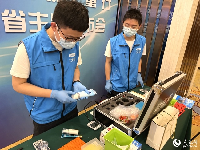 活動(dòng)現(xiàn)場(chǎng)對(duì)消費(fèi)者點(diǎn)名的化妝品產(chǎn)品進(jìn)行快速檢測(cè)。人民網(wǎng) 吳舟攝