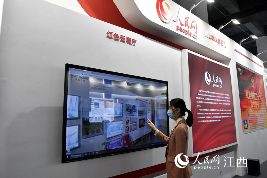 頭部文化企業(yè)展區(qū)的人民網(wǎng)展館內(nèi),工作人員正在調(diào)試紅色云展廳。人民網(wǎng) 時(shí)雨攝