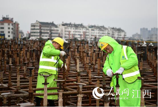 春節(jié)期間,興國縣重點項目紅軍大橋施工現(xiàn)場,工人正在緊張有序作業(yè)。興國縣委宣傳部供圖