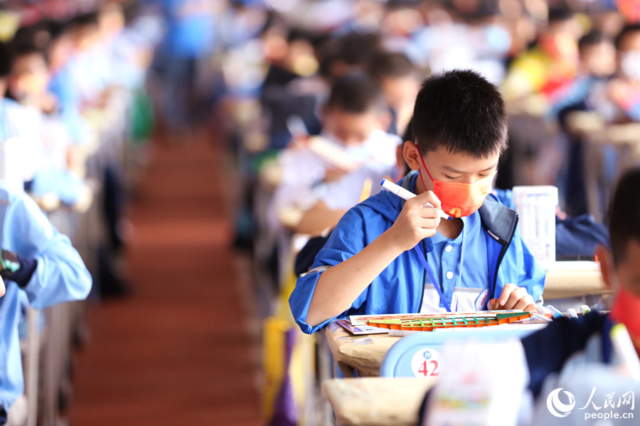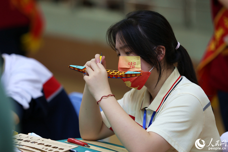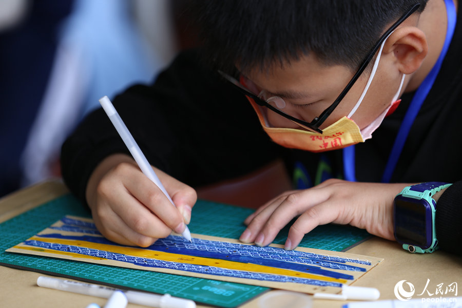活動現(xiàn)場,選手們列隊進入各自賽場,用畫筆在龍舟模型素材板上畫出各式圖案,再將一個個零部件手工拼接,組裝成一條條獨具特色的“小龍舟”,船體或是金銀鱗甲,或是祥云波浪,色彩斑斕,風(fēng)格不一。