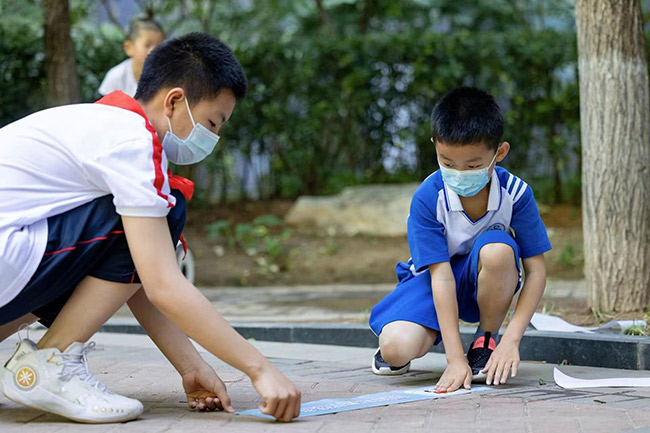 陶然亭街道大吉巷社區(qū)的一處核酸點位上,兩米線安全提示標識引起大伙兒注意。“避免聚集,嚴防疫情”“綠色出行,愛心助考”“文明陪考,安全第一”……誰能想到這些醒目的標語竟然是“陶然娃”們想的“愛心助考公約”?!榜R上就是高考了,希望哥哥姐姐們能取得好成績,不辜負自己多年的努力?!?3歲的陳博一趴在地上,奮力的拍了拍自己剛剛貼好的“公約宣傳條”。