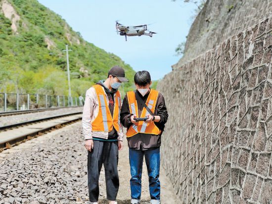 北京工務(wù)段職工利用無(wú)人機(jī)對(duì)高大山體等防洪處所進(jìn)行隱患排查。