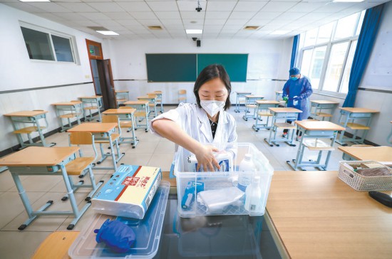 北京東直門中學(xué)考點,老師正在展示考場配備的防疫物品箱,箱內(nèi)配備口罩、消毒酒精等防疫物品。 本報記者 潘之望攝