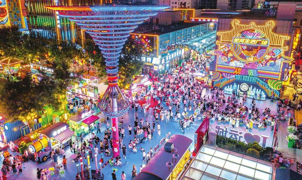 6月11日晚,市民在運(yùn)城市鹽湖區(qū)星河生活廣場(chǎng)消夏。鹽湖區(qū)升級(jí)改造后的星河生活廣場(chǎng)燈光璀璨、人流如織,人們紛紛前來(lái)打卡、購(gòu)物消費(fèi)。(閆鑫攝)