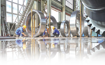 在中國(guó)船舶重慶齒輪箱有限責(zé)任公司,工人們正對(duì)風(fēng)力發(fā)電機(jī)內(nèi)齒圈進(jìn)行清洗及外觀檢查。