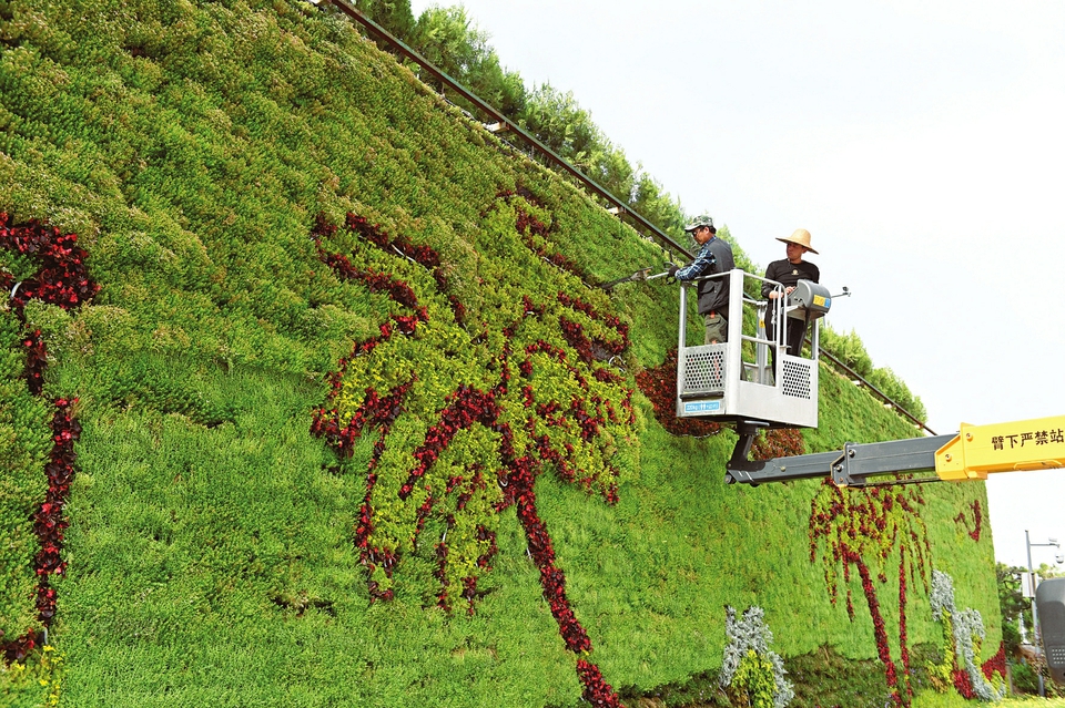 6月9日,太原植物園內(nèi),園藝師在一面布滿綠植的墻面上修剪出一幅美麗的畫(huà)卷。太原植物園開(kāi)放以來(lái),以?xún)?yōu)美的原生態(tài)綠色景觀吸引了大批游客,成為省城綠色生態(tài)“打卡地”。(記者阮洋攝)