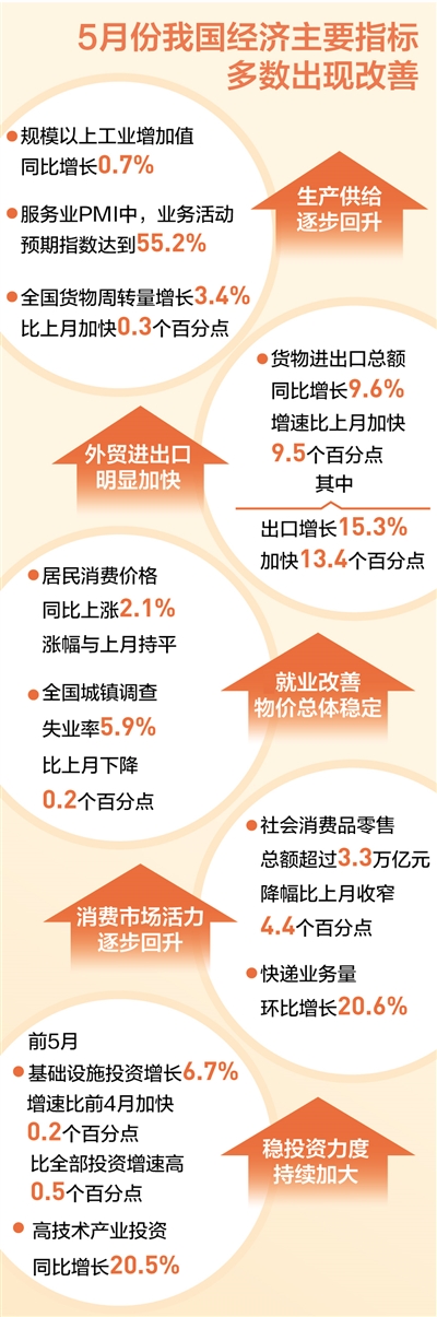 5月,我國經(jīng)濟(jì)運行出現(xiàn)積極變化,主要指標(biāo)多數(shù)出現(xiàn)改善。