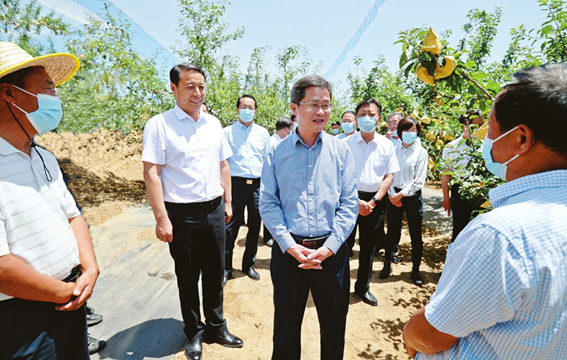 6月14日,省委副書(shū)記、省長(zhǎng)、省總河長(zhǎng)藍(lán)佛安來(lái)到吉縣柏山寺鄉(xiāng)“雙千畝”蘋果高新示范基地,與專業(yè)果樹(shù)種植戶親切交談,詳細(xì)了解基地建設(shè)及生產(chǎn)營(yíng)銷開(kāi)發(fā)等情況。 本報(bào)記者李兆民攝