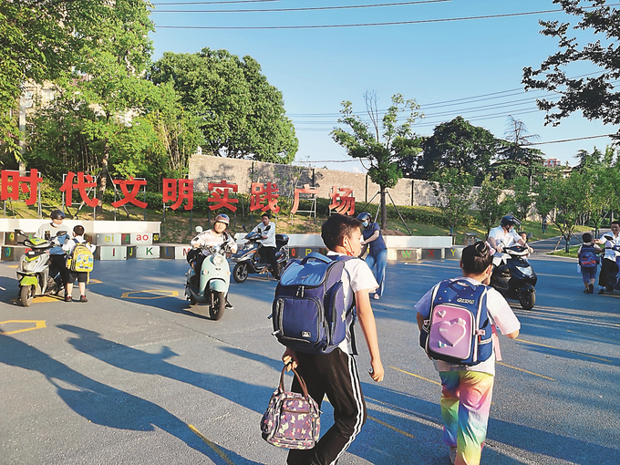 南京市棲霞區(qū)實(shí)驗(yàn)小學(xué)西門(mén)前的口袋公園廣場(chǎng)上,孩子們歡笑著跑向父母。 劉玉琴 攝