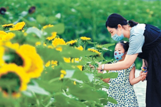 昨天,奧林匹克森林公園北園西門附近的“花田野趣”景區(qū),部分品種的向日葵競相綻放,吸引不少市民前來打卡拍照。 本報記者 程功攝