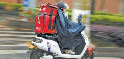 在江蘇蘇州市街頭,一名外賣配送員冒雨騎行,為消費(fèi)者提供便利。
