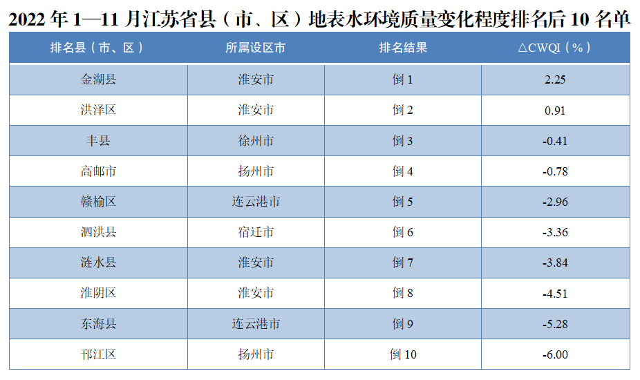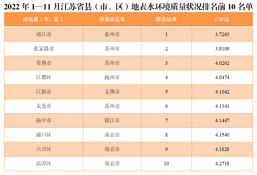 具體看來,2022年1—11月,63個縣(市、區(qū))中,地表水環(huán)境質(zhì)量相對較好的前10位(1—10名)依次是靖江市、張家港市、常熟市、江都區(qū)、江陰市、太倉市、揚中市、浦口區(qū)、六合區(qū)、高淳區(qū)。相對較差的后10位(倒1—10名)依次是銅山區(qū)、漣水縣、豐縣、泗洪縣、東海縣、贛榆區(qū)、洪澤區(qū)、沭陽縣、金湖縣、淮陰區(qū)。