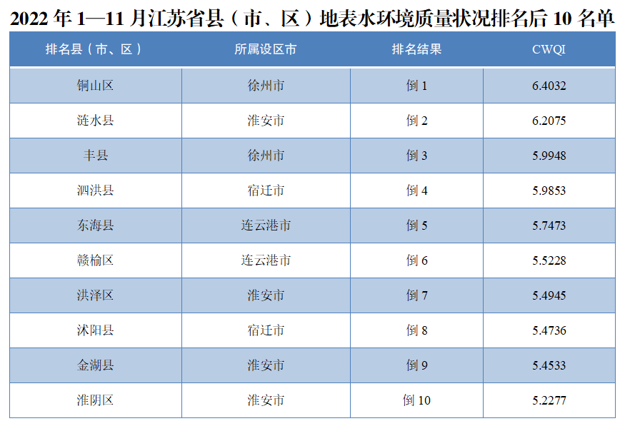2022年1至11月江蘇地表水環(huán)境質(zhì)量排名公布 銅山漣水豐縣等排名倒數(shù)