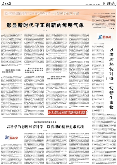 以科學(xué)的態(tài)度對(duì)待科學(xué)、以真理的精神追求真理,是中國(guó)共產(chǎn)黨人對(duì)待科學(xué)真理的一貫立場(chǎng)和鮮明態(tài)度。推進(jìn)馬克思主義中國(guó)化時(shí)代化是一個(gè)追求真理、揭示真理、篤行真理的過程。100多年來,我們黨牢牢把握真理、守住正道,把馬克思主義基本原理同中國(guó)具體實(shí)際相結(jié)合、同中華優(yōu)秀傳統(tǒng)文化相結(jié)合,將其靈活地而不是刻板地、辯證地而不是教條地運(yùn)用于實(shí)踐,不斷推進(jìn)馬克思主義中國(guó)化時(shí)代化,用發(fā)展著的馬克思主義指導(dǎo)我國(guó)革命、建設(shè)、改革事業(yè),取得舉世矚目的偉大成就。黨的十八大以來,以習(xí)近平同志為核心的黨中央堅(jiān)持解放思想、實(shí)事求是、守正創(chuàng)新,既堅(jiān)持馬克思主義基本原理和科學(xué)社會(huì)主義基本原則,又與時(shí)俱進(jìn)發(fā)展馬克思主義,著眼生動(dòng)鮮活的新實(shí)踐新發(fā)展不斷作出新的理論創(chuàng)新創(chuàng)造,賦予馬克思主義鮮明的實(shí)踐特色、民族特色、時(shí)代特色,創(chuàng)立了習(xí)近平新時(shí)代中國(guó)特色社會(huì)主義思想。這一重要思想站在真理和道義的制高點(diǎn)上,以全新的視野深化對(duì)共產(chǎn)黨執(zhí)政規(guī)律、社會(huì)主義建設(shè)規(guī)律、人類社會(huì)發(fā)展規(guī)律的認(rèn)識(shí),以原創(chuàng)性理論貢獻(xiàn)標(biāo)注了馬克思主義發(fā)展的新高度,體現(xiàn)科學(xué)社會(huì)主義理論邏輯和中國(guó)社會(huì)發(fā)展歷史邏輯的辯證統(tǒng)一,彰顯守正創(chuàng)新的理論品格和鮮明特質(zhì),實(shí)現(xiàn)了馬克思主義中國(guó)化時(shí)代化新的飛躍。