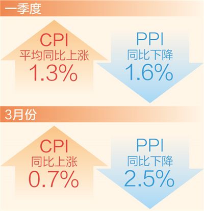 本報北京4月11日電 (記者劉志強)國家統(tǒng)計局11日發(fā)布數(shù)據(jù)顯示:3月份,CPI(居民消費價格指數(shù))同比上漲0.7%,漲幅比上月回落0.3個百分點;PPI(工業(yè)生產者出廠價格指數(shù))同比下降2.5%,降幅比上月擴大1.1個百分點。從一季度看,CPI平均同比上漲1.3%,PPI同比下降1.6%。一季度CPI持續(xù)運行在合理區(qū)間,物價保持平穩(wěn)運行,為全年物價穩(wěn)定奠定了堅實基礎。