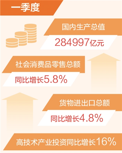 國內(nèi)需求逐步擴大。一季度,社會消費品零售總額同比增長5.8%,服務(wù)零售額保持兩位數(shù)增長。一季度,固定資產(chǎn)投資同比增長5.1%,與上年全年持平。