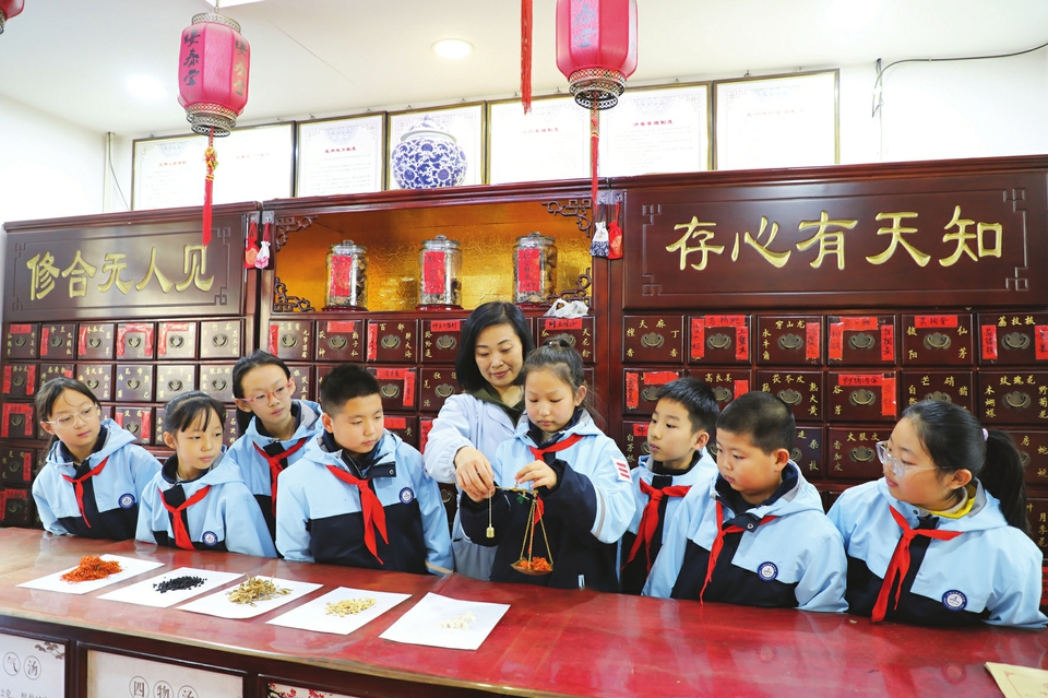12月7日,陽泉市城區(qū)小陽泉北社區(qū)黨委聯(lián)合陽泉市實驗小學,開展了“學習草藥知識、感受中醫(yī)魅力”課外實踐活動。孩子們來到藥店,通過識別中草藥、稱量、加工中草藥材等具體活動,近距離體驗中醫(yī)藥傳統(tǒng)文化特色,感受中醫(yī)藥魅力。圖為孩子們在藥劑師的指導下稱量中草藥。(張春林攝)