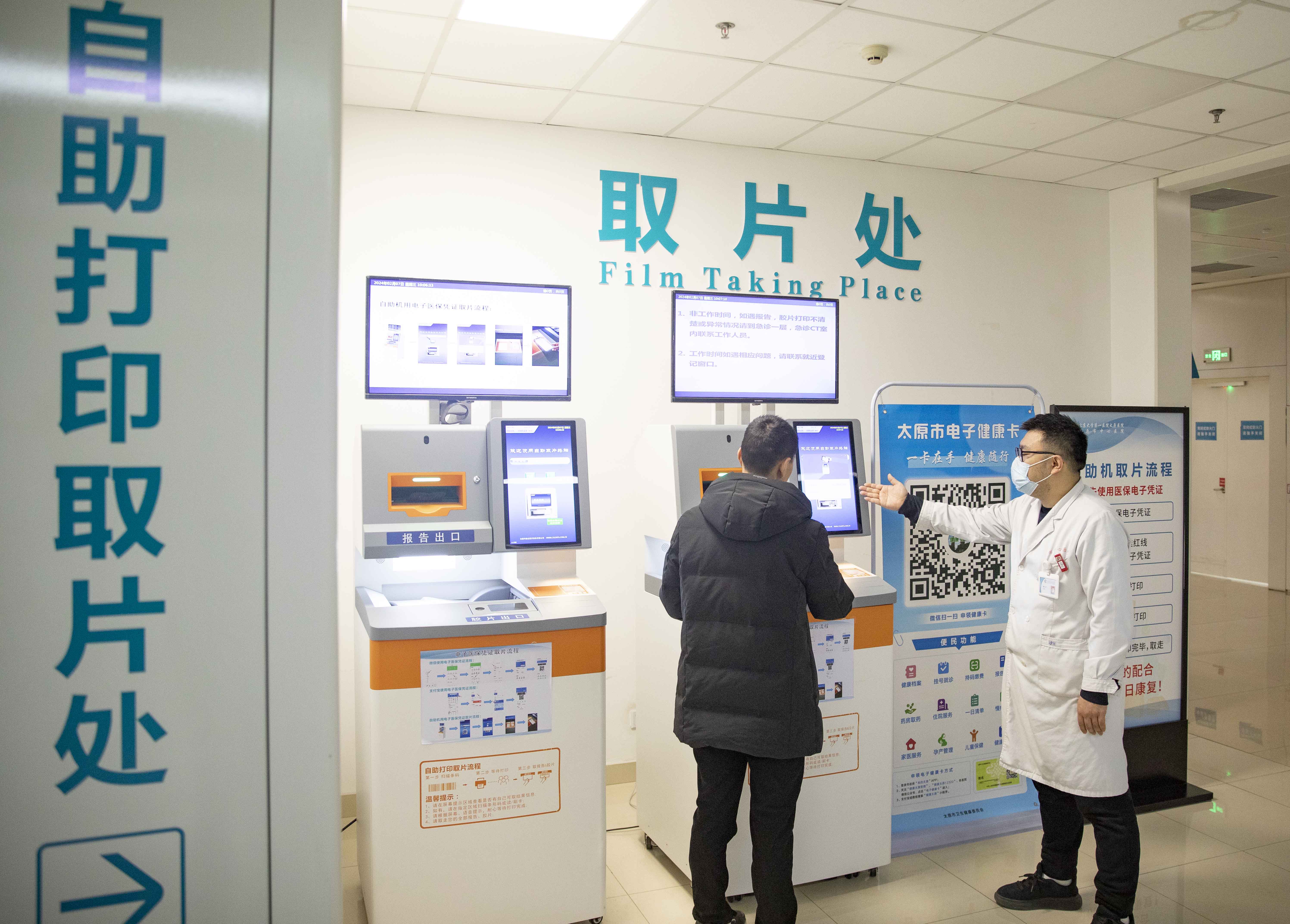 北大醫(yī)院太原醫(yī)院(市中心醫(yī)院)汾東院區(qū)醫(yī)護人員指導患者使電子健康卡自助掃碼取片。人民網記者王帆攝