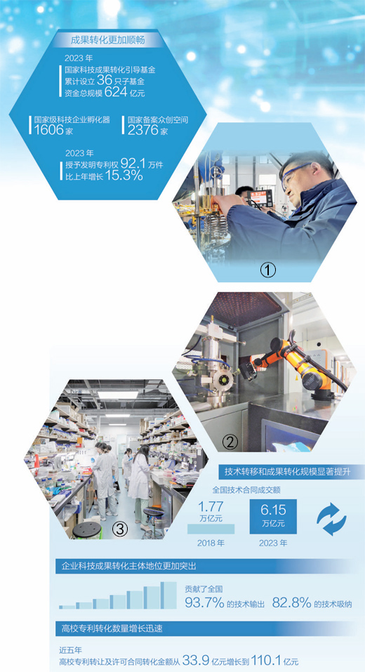 印發(fā)《“十四五”技術要素市場專項規(guī)劃》,從健全科技成果產權制度、強化高質量科技成果供給等方面推動成果轉化;印發(fā)《專利轉化運用專項行動方案(2023—2025年)》,對專利轉化運用進行專門部署;制定《高校和科研機構存量專利盤活工作方案》,發(fā)揮市場和政府的協(xié)同作用,共同推動專利成果更好更快地轉化為現實生產力……近年來,一系列部署,一項項探索,讓創(chuàng)新鏈的好技術變成產業(yè)鏈的新應用,科技創(chuàng)新正在成為培育發(fā)展新質生產力的新動能。