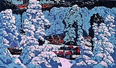 充滿粗獷刀味和雄渾之氣的色塊構(gòu)成,是晁楣版畫的魅力所在。他的藝術(shù)風(fēng)格從何而來?答案源于其在創(chuàng)作實(shí)踐中的自我體悟。在藝術(shù)創(chuàng)作中,晁楣深刻把握了藏與露、簡與繁、整體與局部等多對(duì)概念之間的對(duì)立統(tǒng)一關(guān)系。與以人為主要表現(xiàn)對(duì)象的傳統(tǒng)黑白木刻有所不同,他的套色木刻以北大荒雄渾壯闊的風(fēng)景為主要題材。大色塊的構(gòu)成可以鮮明地表現(xiàn)山川、樹木的色彩關(guān)系,遠(yuǎn)景的人物因形象被縮小,化作外形概括的色塊,為畫面提供了精彩的細(xì)節(jié)。如《北方九月》《戰(zhàn)油?!贰都t裝素裹》《秋歌》《松谷》等作品,皆是在鳥瞰式的場景中以大色塊鋪陳畫面,再將人、鷹、馬、車等物象轉(zhuǎn)化為斑斕的色塊點(diǎn)綴其中,使得作品既有宏觀的場景表現(xiàn),亦有微觀的敘事呈現(xiàn),兩者相得益彰、相映成趣,呈現(xiàn)出濃郁的個(gè)人創(chuàng)作風(fēng)格。