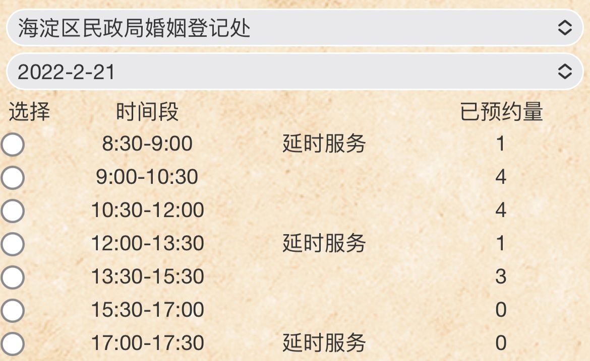 2020年9月起,北京推出政務(wù)“延時(shí)服務(wù)”,工作日除早晚提供半小時(shí)延時(shí)服務(wù)外,取消工作人員午休時(shí)間,周六延時(shí)工作一天。目前,全市婚登服務(wù)從8時(shí)30分持續(xù)至17時(shí)30分,全天分為7個(gè)預(yù)約時(shí)段。截至記者發(fā)稿時(shí),東城、西城、朝陽(yáng)、海淀、順義、大興等多區(qū)僅剩兩個(gè)時(shí)段還可預(yù)約。