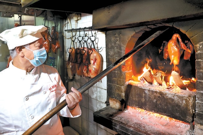 脫下便裝,穿上工作服,手拿烤鴨桿的張立群烤起鴨子來駕輕就熟。翻個、挪移、轉圈,爐火中,鴨坯逐漸由白色變成棗紅,滲出的油泛著亮光,香味透了出來。已是飯點,等候的食客不時向操作間望去,只待烤鴨上桌,便可大快朵頤。