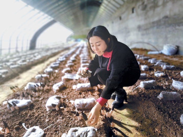 一頭利落的短發(fā),筆挺的身姿,明亮的笑容,39歲的董偉給人的第一印象有點颯。跟隨她來到位于懷柔區(qū)廟城鎮(zhèn)王史山村的溫室大棚,只見一個個小傘般的蘑菇頂蓋從土中鉆出來,看上去皺皺巴巴,筆直的菌柄呈象牙白色,村民們手持特制的小彎刀,嫻熟地將蘑菇從根部割下,不一會兒就裝滿了一筐?!斑@是羊肚菌,一種珍稀食用菌,聞起來有一股淡淡的香味?!闭f起蘑菇種植,董偉如數(shù)家珍,“羊肚菌是低溫菇,溫度一上來就不行了,收獲已經(jīng)接近尾聲?!?/p>