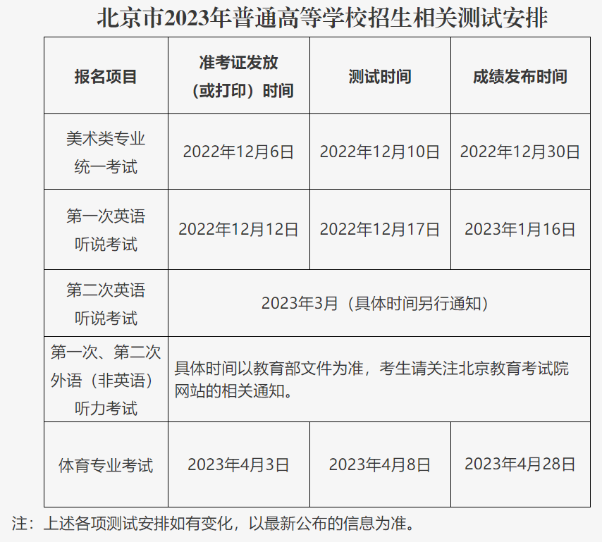 ?。ㄋ模?023年普通高等學(xué)校招生美術(shù)類專業(yè)統(tǒng)一考試、體育專業(yè)考試、英語聽說考試、外語(非英語)聽力考試報名與高考報名同期進(jìn)行,符合條件擬報名參加相關(guān)測試的考生須選報相關(guān)項目并繳費。