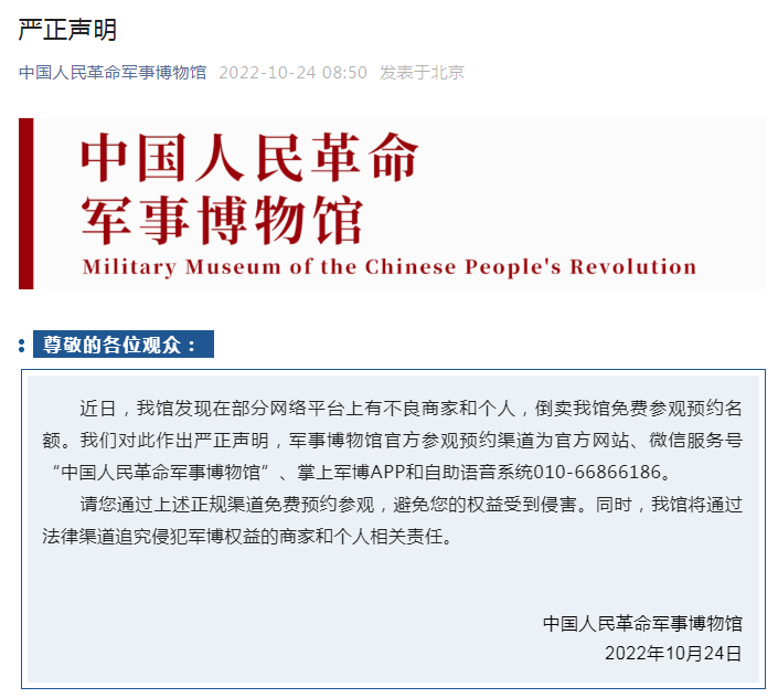 近日部分網(wǎng)絡(luò)平臺上有商家和個人倒賣該館免費參觀預(yù)約名額。對此,軍博嚴(yán)正聲明,該館參觀預(yù)約渠道為官方網(wǎng)站、微信服務(wù)號“中國人民革命軍事博物館”、掌上軍博APP和自助語音系統(tǒng)010-66866186。觀眾要通過上述正規(guī)渠道免費預(yù)約參觀,避免權(quán)益受到侵害。同時,該館將通過法律渠道追究侵犯軍博權(quán)益的商家和個人相關(guān)責(zé)任。