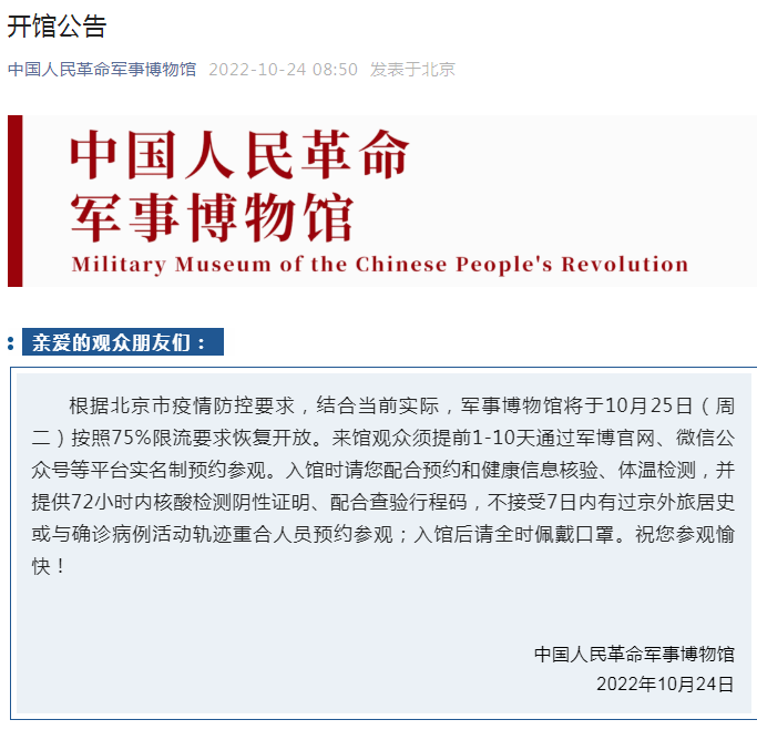 中國人民革命軍事博物館10月24日發(fā)布公告,該館將于25日(周二)按照75%限流要求恢復(fù)開放。