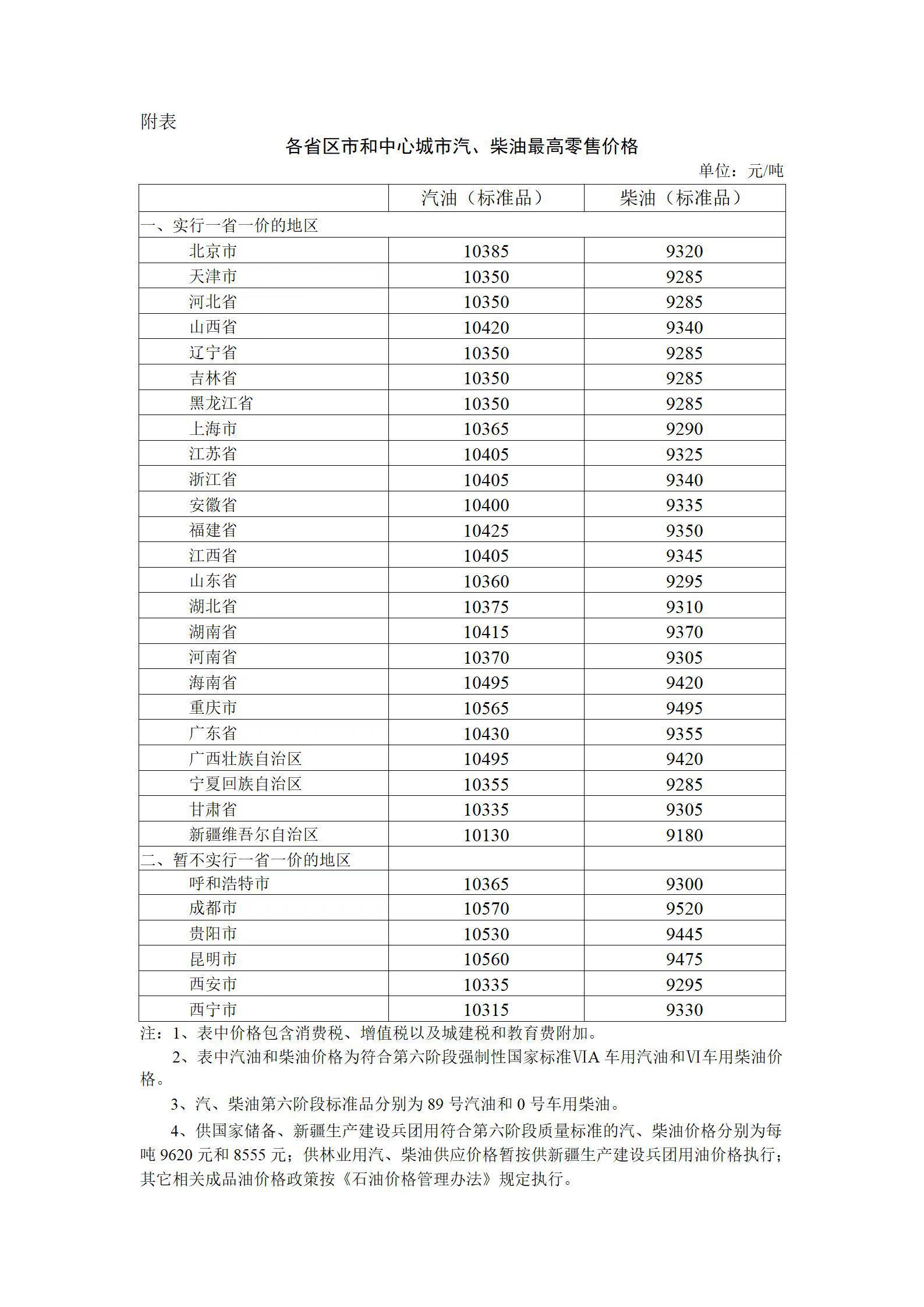 央廣網(wǎng)北京10月24日消息 據(jù)國家發(fā)展改革委官方網(wǎng)站消息,根據(jù)近期國際市場油價變化情況,按照現(xiàn)行成品油價格形成機(jī)制,自2022年10月24日24時起,國內(nèi)汽、柴油價格(標(biāo)準(zhǔn)品,下同)每噸分別提高185元和175元。調(diào)整后,各省(區(qū)、市)和中心城市汽、柴油最高零售價格見下表。相關(guān)價格聯(lián)動及補(bǔ)貼政策按現(xiàn)行規(guī)定執(zhí)行。