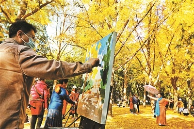 藝術(shù)家進(jìn)園林,“落葉拼金秋”,在參觀完地壇公園內(nèi)標(biāo)志性的點(diǎn)位后,藝術(shù)家們帶著自己的作畫工具,選取心儀的一角,用畫筆勾勒心中最美地壇。園內(nèi),還有群眾自發(fā)的樂(lè)隊(duì)、舞蹈團(tuán)等藝術(shù)團(tuán)體及攝影愛(ài)好者,用自己獨(dú)特的方式“記錄”地壇秋景,讓古老地壇充分沾染“文藝范兒”。