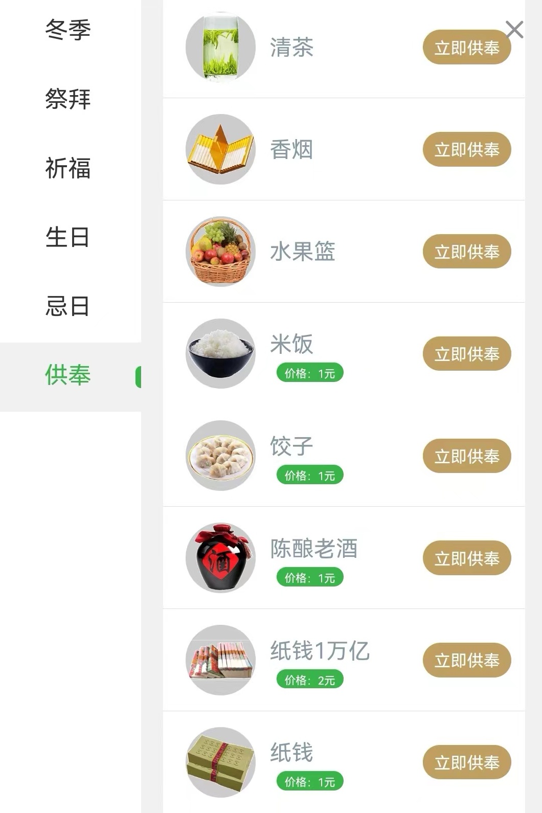 記者發(fā)現(xiàn),用戶免費創(chuàng)建“網(wǎng)上紀(jì)念館”后,可以在紀(jì)念館進行“祭拜、祈福、獻花、供奉”等虛擬活動。而在推出的這些虛擬服務(wù)中,有些是免費的,有些則要收取費用。比如,在某平臺送出一個“生日快樂”蛋糕,需要微信支付2元,送一疊“忌日紙錢”需要支付1元,一份“米飯”1元。