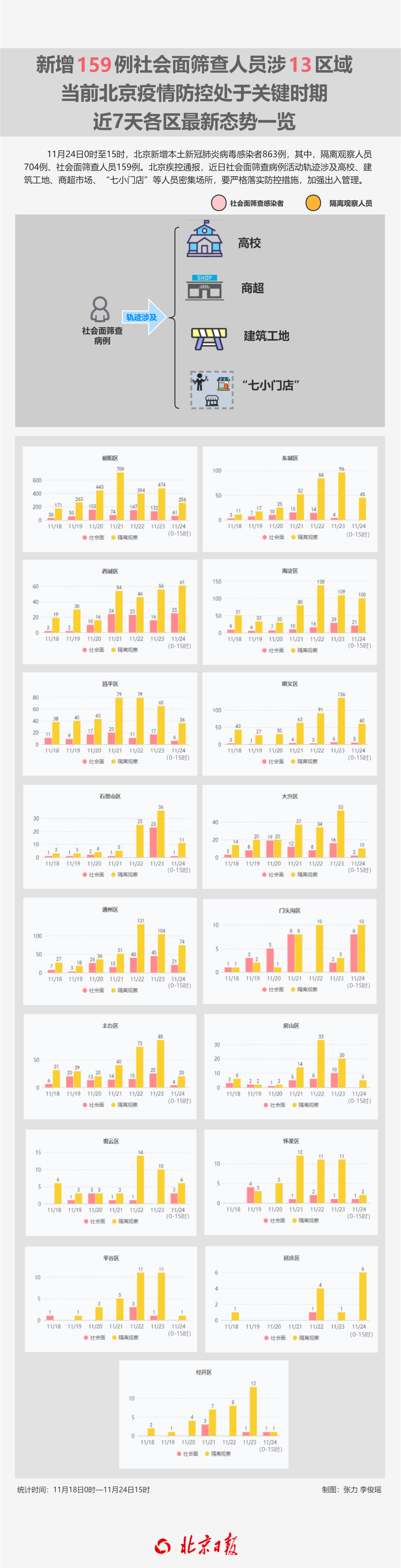 11月24日0時(shí)至15時(shí),北京新增本土新冠肺炎病毒感染者863例,其中,隔離觀察人員704例、社會(huì)面篩查人員159例;朝陽(yáng)區(qū)317例,海淀區(qū)121例,通州區(qū)95例,西城區(qū)86例,順義區(qū)65例,東城區(qū)45例,昌平區(qū)42例,豐臺(tái)區(qū)24例,門(mén)頭溝區(qū)18例,石景山區(qū)、大興區(qū)各12例,密云區(qū)9例,延慶區(qū)6例,房山區(qū)5例,懷柔區(qū)3例,經(jīng)開(kāi)區(qū)2例,平谷區(qū)1例;重型3例、普通型2例、輕型164例、無(wú)癥狀感染者694例。